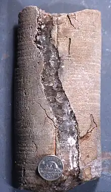 Effective combinations of a number of geological factors must occur for a basin to have generated, trapped and preserved hydrocarbons (oil and/or gas). The nature of the sediments deposited during and after the three rift episodes which affected the Jeanne d'Arc Basin [9][10] and the numerous complex structures formed in response to the changing stress regimes through Mesozoic time have proven critical to the basin's hydrocarbon prospectivity.[19][7] First, large volumes of halite salt of the Argo Formation were precipitated in the basin during the Late Triassic to earliest Jurassic.[20][21][22][15] These salt beds with interbeds of dolomite were precipitated atop and adjacent to continental clastic facies (alluvial plain sandstones and red shales) of the Eurydice Formation. The presence of this thick salt unit throughout the Jeanne d'Arc Basin has been an important factor in subsequent structural deformation and hydrocarbon trap formation during later rift episodes. It provided a widespread interval of low shear strength which acted as a sub-horizontal detachment horizon between vertically stacked zones of strain.[23] Consequently, precipitation of salt during the first Mesozoic rift episode resulted in partial isolation of crustal extension from extension and creation of structural traps of the overlying sedimentary column during subsequent rift episodes recognized in the Jeanne d'Arc Basin.