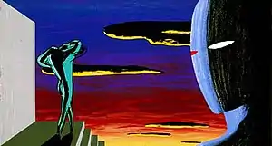 Influenced by surrealist painter Giorgio de Chirico, Garet uses garish colors in jarring contrasts to explore relationships between nature, man, and art. He combines human figures, classical architectural fragments and abstraction in narrative works, and is known for his amorphous life forms. Nothing Too Strange and Beautiful, in the collection of the Honolulu Museum of Art demonstrates this phase of the artist's monumental sculpture. It was originally created as a folly for a sculpture park exhibition at Wave Hill in New York City.[2] In later work, figures, trees and other more recognizable objects were added to the minimalist flat ground, creating tension.[3]