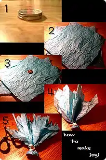 Traditionally, a jegi is made by taking a coin with a hole through the middle, and a sheet of hanji paper.[5] The paper is folded in half, the coin is placed in the middle of the folded paper, and the paper is folded several times again with the coin still inside the paper. A sharp object is then used to pierce a hole through the paper, also passing through the hole in the coin. Each end of the folded paper is then inserted into the hole, and the ends of the paper are unfolded and torn into strands.