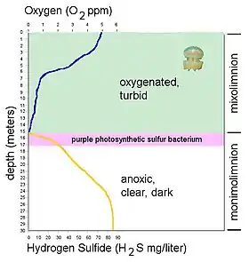 The anoxic layer extends from about 15 metres (49 ft) below the surface to the bottom of the lake. The oxygen concentration in this layer is zero. The hydrogen sulfide concentration rises from about zero at the top of this layer to over 80 mg/liter at the bottom of the lake. The top three meters of this layer contains a dense population of bacteria, at least one species of which is a purple photosynthetic sulfur bacterium. This bacterial layer absorbs all sunlight so that the anoxic layer below the bacterial plate is dark, but transparent. Hamner estimated the visibility to be about 30 meters. The anoxic layer also contains high concentrations of ammonia and phosphate which are almost completely absent from the upper layer. The anoxic layer is potentially dangerous for divers, who can be poisoned through their skin. This risk is mitigated as scuba diving equipment is not allowed in the lake, thus limiting the depths to which individuals may dive.[5]
