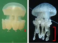 - ↑ Dawson, Michael N; Hamner, William M (December 2003). "Geographic variation and behavioral evolution in marine plankton: the case of Mastigias (Scyphozoa, Rhizostomeae)" (PDF). Marine Biology. 143 (6): 1161–1174. doi:10.1007/s00227-003-1155-z. S2CID 30556970.