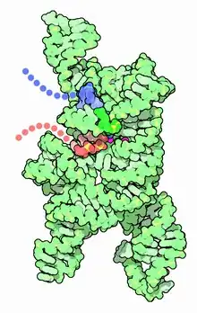 At Yale, Doudna's group was able to crystallize and solve the three-dimensional structure of the catalytic core of the Tetrahymena Group I ribozyme.[8] They showed that a core of five magnesium ions clustered in one region of the P4-P6 domain of the ribozyme, forming a hydrophobic core around which the rest of the structure could fold.[8] This is analogous, but chemically distinct from, the way proteins typically have a core of hydrophobic amino acids.[8] Her group has crystallized other ribozymes,[15] including the Hepatitis Delta Virus ribozyme.[8] This initial work to solve large RNA structures led to further structural studies on an internal ribosome entry site(IRES) and protein-RNA complexes such as the Signal Recognition Particle.[8]