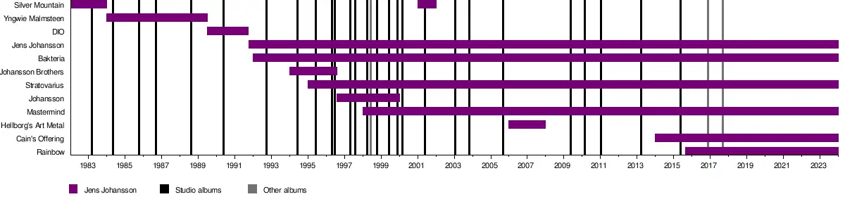 He co-founded Heptagon Records to distribute his own recordings and that of other musicians, such as guitarist Benny Jansson and bassist Magnus Rosén. Johansson auditioned for Dream Theater after Kevin Moore left the band in 1994[3] but due to many delays by the band in making a decision he instead joined Finnish power metal band Stratovarius. Since 1995 he has remained in Stratovarius, and still releasing solo albums and appearing as a guest or session musician in other projects.