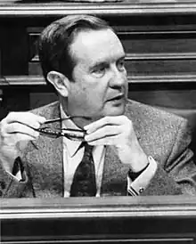 On 21 June 1985 he resigned after a report in Parliament opposed to the Accession Treaty of Spain to the European Economic Community, referring to the Protocol II on the Canary Islands, which had been signed a few days earlier, was successful.[5][6][9] Even so, the following 15 July, thanks to the "Progress Pact" signed by the PSC-PSOE, the Communist Party and the nationalist forces, he was again sworn in as president of the Canary Islands.[5][6] Saavedra stood for re-election in 1987. Although his party won a plurality of seats, a centre-right agreement made Fernando Fernández Martín the new president on 30 July 1987.[5][10]
