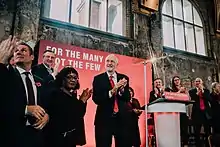 Corbyn was elected Leader of the Labour Party in 2015. The party's membership increased sharply, both during the leadership campaign and following his election.[6] Taking the party to the left, he advocated renationalising public utilities and railways, a less interventionist military policy, and reversals of austerity cuts to welfare and public services. Although critical of the European Union, he supported continued membership in the 2016 referendum. After Labour MPs sought to remove him in 2016 through a formal leadership challenge, he won a second leadership contest. In the 2017 general election, Labour increased its share of the vote to 40%, with its 9.6% vote rise their largest improvement since the 1945 general election. This resulted in a net gain of 30 seats and a hung parliament; but the Conservative Prime Minister, Theresa May, formed a minority government and Labour remained in Opposition. In 2019, after deadlock in Parliament over Brexit, Corbyn endorsed holding a referendum on the withdrawal agreement, with a personal stance of neutrality. In the 2019 general election, Labour's vote share fell to 32%, leading to a net loss of 60 seats and leaving it with 202, its fewest since 1935. Corbyn said he would not lead Labour into the next election, triggering a leadership election in 2020 that was won by Keir Starmer, his Shadow Brexit Secretary.