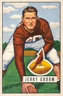 Jerome Paul "Boomer" Groom (August 15, 1929 – February 29, 2008) was an American football player. Born in Des Moines, Iowa, he graduated from Dowling Catholic High School in Des Moines. He played college football for the Notre Dame Fighting Irish football team and was a consensus selection at the center position on the 1950 College Football All-America Team.[1] He then played professional football in the National Football League (NFL) for the Chicago Cardinals from 1951 to 1955. He was chosen to play in the 1954 Pro Bowl.