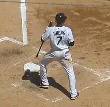 In spring training for the White Sox in 2006, Owens had to compete with Brian Anderson for the job of center fielder, but White Sox general manager Kenny Williams stated that Owens would probably not get the job because he had a shoulder injury a few years before.[6] Owens was put on the White Sox' extended 40-man roster, and was optioned back to the International League with the Triple-A Charlotte Knights. He batted .262 with four home runs and 48 RBI in 112 games, and showed development in his base-stealing, stealing 40 bases and being caught only 12 times.[3] Owens was called up and made his major league debut as a pinch runner on September 11, 2006 against the Los Angeles Angels of Anaheim.[7] His first start came on September 27, a game in which he collected both his first hit and stole his first base as a major leaguer.[8]