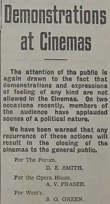 When the Germans arrived, there were three cinemas in operation in Jersey: the Forum (opened 1935), the Opera House, and Wests (opened 1909). The Forum, as the largest cinema, was commandeered by the Germans for entertaining the troops. The two remaining cinemas had a mere 32 feature films in stock to last during the Occupation. The Opera House and Wests arranged an alternating programme between themselves, so that a week of cinema was followed by a week of stage performance and that when the Opera House was staging a play, Wests was showing a film, and vice versa.[6]