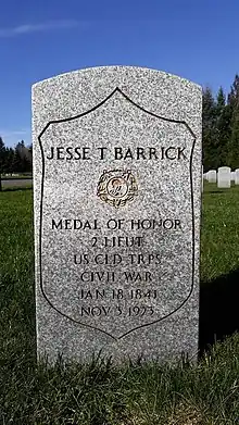 Second Lieutenant Jesse T. Barrick (January 18, 1841 – November 3, 1923)[2] was an American soldier who fought in the American Civil War. Barrick was awarded the country's highest award for bravery during combat, the Medal of Honor, for his action along the Duck River in Tennessee between May 26 and June 2, 1863. He was honored with the award on March 3, 1917.[2][3]