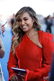 Mauboy is known for her good girl image[157] and is considered a role model to young girls and Indigenous communities in Australia.[158][159][160] Ed Gibbs of The Sydney Morning Herald described her as a "wholesome girl-next-door",[161] while Holly Richards of New Idea noted that she "is renowned for her squeaky-clean image and family values."[162] Genevieve Rosen of The Vine wrote that Mauboy's "flawless public image is no farce. Humble, genuinely engaging and passionate about public service, Mauboy, put simply, is really nice."[163] Anna Byrne of the Herald Sun observed, "It's clear this endearing unpretentiousness is not a fame facade. In every respect, the pint-sized pop star embodies one of the most elusive qualities of stardom: relatability. It's this genuineness that has seen her star ascend to where she actually is."[164] Fashion has influenced Mauboy's music career and image. Byrne noted that her "fashion choices have mirrored her rise in fame, with her style evolving from shy schoolgirl to confident diva, set to steal the sartorial spotlight."[164] Mauboy cites Jennifer Lopez as her style icon.[153] She has worn dresses designed by Dolce & Gabbana, J'Aton, Steven Khalil and Toni Matičevski,[164] and has appeared on the covers of fashion magazines in Australia, including Elle,[165] InStyle,[166] and Marie Claire.[167] She has also appeared on the cover of Who magazine's Sexiest People issue twice; first in 2012 and again in 2016.[168][169]
