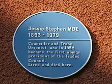 Stephen's life is commemorated by a blue plaque at her former home in Bedminster, Bristol.[17] On 10 November 1995, the Party of European Socialists group in Bristol honoured her memory by holding the inaugural Jessie Stephen memorial lecture, 'Women in European politics'.[1]