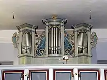 In 1715 the church was refurbished and altered.[3] The nave has been lengthened towards the east and the windows were altered in their forms.[2] The new, longer nave received a flat ceiling above a circular ledge, carried by busts of angels (German: Engelsflüchte(n)).[2] On the southern side a chapel was added to the building, which now houses the heating system.[2]