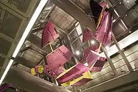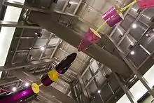 Mike Ross's Jet Kiss is suspended approximately 50 feet (15 m) above the platform of Capitol Hill station, a light rail station in Seattle's Capitol Hill neighborhood.[1][2] The piece consists of two decommissioned United States Navy A-4 Skyhawk fighter jets, which were disassembled and painted magenta and yellow.[1] The military markings are preserved with a layer of translucent paint. Both jets are arranged nose-to-nose and span 90 feet (27 m) along the platform, fitting between struts that form the station's walls.[1][3]