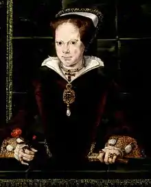 The Count of Feria, heard that Mary had given Philip II a coffer with jewels that had belonged to Henry VIII, including a jewelled dagger, which remained in London.[55] Jane Dormer, Countess of Feria, Mary's former lady in waiting, delivered jewels to Elizabeth I in 1559, some of which had been Mary's.[56] The list includes a tablet with an Imperial spread eagle of diamonds on one side and two diamond pillars and the Emperor's word on the other, with a closed crown and the toison d'or, with three pendant pearls; with a "picture of Queen Marie in golde with a boxe of wood"; and a "little tablet of ten pearls which was one of the Queen's majesty's that now is (Elizabeth's), as Mistress Parry says".[57] Blanche Parry, Lady Knollys and Margery Norris scrutinised the returned jewels for defects and losses.[58][59]