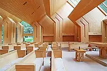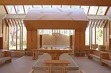 Over the years the unstained exterior has weathered to an inky brown, while the finished interior paneling retains the pale blush of newly sawn wood. Architect I.M. Pei has said, “Architecture has to have an element of time.”[7] Here, time expresses itself in the building's patina, amplifying the architectural message by distinguishing the realities of the exterior world from the eternal quality of the spiritual realm.