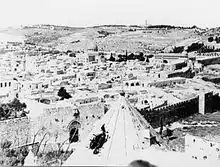 Between 1910 and 1948, the number of Jews in Jerusalem rose from 45 to 100 thousand and within these totals the Old City's Jewish population fell from 16 to 2 thousand over the same period.[32] According to Benny Morris, quoting a British diplomat, the nearly all-Orthodox community were "on good terms with their Arab neighbours", resented the Haganah presence, and "were loath to see their homes sacrificed to Zionist heroics".[33] Before 1948, the quarter extended over 4 or 5 acres, and Jewish-owned property amounted to less than 20% of that.[31]