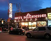 A Jewish deli, also known as a Jewish delicatessen, is a delicatessen establishment that serves various traditional dishes in Ashkenazi Jewish cuisine. They are typically known for their sandwiches such as pastrami on rye, as well as their soups such as matzo ball soup, among other dishes. Most of these establishments are traditionally considered Ashkenazi. Like much of the Jewish cuisine stemming from the period of the Jewish diaspora, the emergence of the Jewish deli developed in accordance with local culture. These days, Jewish delicatessens serve a variety of Jewish dishes. While some delis have full kosher-certification, others operate in a kosher-style, refraining from mixing meat and dairy in the same dish, despite potentially using non-certified ingredients.[1] There are also delis that serve food without adhering to any traditional Jewish dietary restrictions, offering non-Kosher dishes such as the Reuben sandwich.