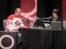 From April 16, 2007, to October 26, 2014, Ghomeshi was the host of Q, a program airing twice daily on CBC Radio One, and on over 170 stations in the U.S. through Public Radio International. As the host of Q, he interviewed a range of musicians, artists, actors, and other notable figures, a list that included Woody Allen, Paul McCartney, Salman Rushdie, Barbara Walters, William Shatner, Jay-Z, Jimmy Wales, and Leonard Cohen.[2] In 2012, Ghomeshi received the Gold Award for best talk show host at the New York Festivals' International Radio Awards.[12] By 2013, with Q had a weekly audience of more than 2.5 million listeners weekly in Canada and 550,000 listeners in the U.S.[32] During his time as host of Q, Ghomeshi many times booked guests who shared his agent and lawyer without disclosing this connection.[33]