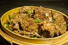 粉蒸肉 Fěnzhēngròu In Jiangxi cuisine, people also steamed other meats with rice flour such as beef, chicken, fish, and so on.[5]