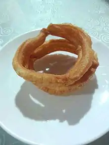 Jiao quan (Chinese: 焦圈; pinyin: jiāoquān; or xiaoyougui; also called fried ring) is a dish from Beijing cuisine. It has a golden color, shaped like a bracelet. It feels crispy and crunchy when eaten. The unique taste of it is very popular in Beijing cuisine.[1] People usually eat jiaoquan with shaobing and douzhi.
