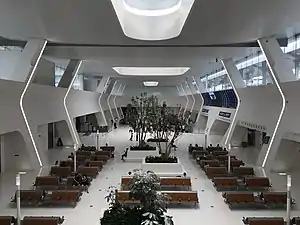 The current station building and surrounding facilities of Jiaxing Station will be put into use in 2021, and will be planned and designed by MAD Architects led by Ma Yansong. There are two station buildings in the north and south of the station, both of which are arranged under the line side. Passengers enter and exit the station using the bottom-in and bottom-out mode, and the maximum number of people gathered per hour is 2,500.[11] The facades of the two station buildings are decorated with aluminum-magnesium-manganese metal roof panels, and the roofs are paved with solar power generation photovoltaic modules with a total capacity of about 1.2 MW using building-integrated photovoltaic (BIPV) technology.[18] Among them, the south station building is located on the south side of the line, with an area of 7,700 square meters. There is a station entrance 1 and a ticket office 1 (both temporarily closed),[15] and a Jiaxing tram station is set up on the basement level. The waiting room of the south station building is mainly for the boarding and landing of train passengers bound for Hangzhou, and there is a ticket gate 1.[14]