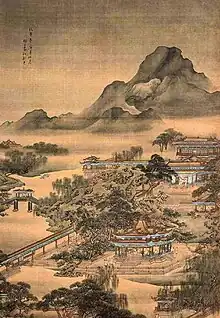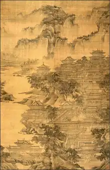 Court patronage for jiehua peaked in the Northern Song period, resulting in the creation of some of the greatest jiehua masterpieces of all time, such as Along the River During Qingming Festival 《清明上河图》.[28] Historian Wen Chien-Cheng suggests that the renaissance of jiehua painting in the Northern Song Dynasty may be attributed to the rising prominence of landscape paintings and appreciation of realism.[28][29] The surviving jiehua works from the Southern Song period typically portray close-ups of structures which were “often juxtaposed with voids that suggest distance and atmospheric mood," an adoption of Southern literati landscape features.[30]