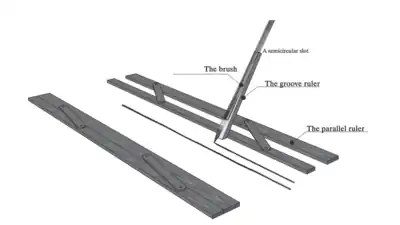 While it is known that jiehua painters commonly utilized a tool called jiechi (界尺), a ruler marked with grooves, to guide their hands in creating precise straight lines needed for architectural detailing, the mechanics of these jiehua tools remain somewhat obscure. Modern scholar Shen Kangshen 沈康身 attempted to reconstruct the historical usage of jiechi in a more generalized manner, relying on a Ming-era instrument.[1] According to Shen, a complete set of jiehua tools consists of a parallel ruler (jiechi 界尺), a groove ruler (caochi 槽尺), and a brush (bi 笔). The parallel ruler comprises two straight edges affixed to two movable rods. By anchoring the lower edge and adjusting the angle between the rods and edges, the upper edge shifts to create parallel lines. The groove ruler, a lengthy, squared-off stick featuring a semicircular slot, securely holds the brush tip, allowing it to engage with the painting surface. The painter affixes the bottom of the groove ruler to the upper edge of the parallel ruler. Subsequently, the right hand maintains the angles between the groove ruler and the parallel ruler, as well as between the groove ruler and the brush. Consequently, the groove ruler smoothly glides seamlessly along the parallel ruler, guiding the brush to consistently produce straight lines.[2]