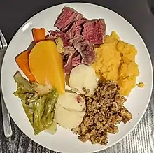 The meal most typically consists of salt beef (or salt riblets), boiled together with potatoes, carrot, cabbage, turnip, and greens. Pease pudding and figgy duff are cooked in pudding bags immersed in the rich broth that the meat and vegetables create.[2] Condiments are likely to include mustard pickles, pickled beets, cranberry sauce, butter, and a thin gravy made from the cooking broth.