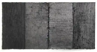 In her "Tonglen Breath Drawings" (2011–12), O'Bryan drew upon the concept of Tonglen breathing, a Buddhist practice of compassion in which practitioners breathe in another's pain, transform it, and breathe out healing.[13][22] In these smaller works (e.g., 18,200 breaths between 4/1/2012 and 4/19/2012), she layered marks atop one another 20 times (equating to 20 breaths) until the rice paper became incised and frayed under the weight of the accumulated graphite; critic Edith Newhall described the resulting surfaces as resembling, "square, monochromatic pieces of a woolly patterned textile."[2][15][5]
