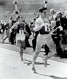 On 6 May 1956, Bailey was part of a mile race at the Los Angeles Memorial Coliseum. The race was a promotional effort to drum up interest in the 1956 Olympics to be held in Australia. His compatriot John Landy was going to make an attempt to become the first person to break the 4 minute mile on American soil. As the NCAA Champion, he joined other top level participants including Bill Dellinger, Jerome Walters, Lon Spurrier and Ron Delany. The lesser known Delany, who would win the Olympic 1500 later that year ran a fast first lap, separating from the field. Landy caught up with Delany a straightaway (100 yards) short of the halfway point in the race, with much of the field still in contact. As Delany continued to lead the pack, Landy broke away off the front, putting more than 10 yards on the field on the backstretch. As others fell off the pace, Bailey moved up with Delany with a lap to go. By this point Landy had a 15-yard lead. Landy accelerated for his final lap, occasionally looking back to see the size of his lead. Bailey too accelerated for his last lap. Down the final backstretch, he was sprinting much faster than Landy, catching him with about 200 yards to go. Landy did not give up, keeping Bailey to his outside the entire turn. Bailey held the advantage coming off the turn and maintained it to the finish, winning by two steps. Landy succeeded in breaking the 4 minute mile, but the first to do it on American soil was Bailey, a tick of a second earlier, running 3:58.6, a 6-second personal record.[5]