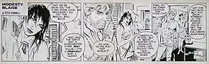 A 1963 Modesty Blaise daily comic strip by Jim Holdaway. The title character and her partner Willie Garvin are shown.