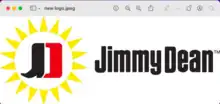 This is a laptop screenshot taken of the new Jimmy Dean Logo published in 2012. In the screenshot the image shows an outline of a sun with the Jimmy Dean initials (J.D.) centered in the logo. The "J" is depicted by a black cowboy boot turned left and a red colored crescent figure for the "D".