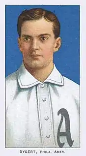 Dygert, a spitball specialist,[1] started his professional baseball career in 1904 in Poughkeepsie, New York. In 1905, he went 18–4 with the pennant-winning New Orleans Pelicans,[2] and he was purchased by the Athletics in August. He pitched a few games down the stretch but went just 1–4. The next season, he broke into the A's starting rotation and improved his record to 11–13. He pitched a combined no-hitter with Rube Waddell on August 29.[3]