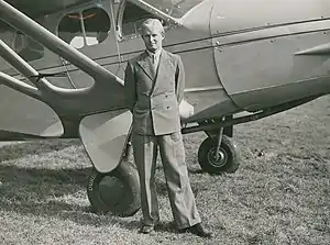 He flew a DH80A Puss Moth registered VH-UQO and christened "My Hildergarde" to England just after his 21st birthday to compete in the race, reaching Croydon in 8 days, 9 hours; a record.[2] He finished the race in 10 days, 16 hours: earning sixth place, second on handicap, the youngest and only solo flier to complete the course. He also owned a Leopard Moth, a faster plane that could not be made ready in time for the race. He gained much assistance from his uncle, Noel Billing, founder of the Supermarine company.[3]