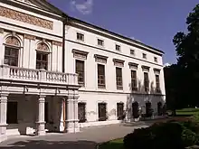 The castle is surrounded by a 4.73 hectares (11.7 acres) large park. It was founded by the Counts of Hodice in the French style in the first half of the 17th century, was adapted to the English-style park in the first half of the 19th century. There is a great variety of rare trees. The park is decorated with several sculptures, the oldest are two marble lions in front of the castle entrance from the 18th century, There is also a fountain and statues of St. Hubert, St. Christopher and Friedrich Schiller.[6]