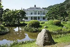 After the Meiji period Jinpūkaku was used as a welcome hall and public gathering place by the City of Tottori. The structure was significantly damaged in the 1943 Tottori earthquake. The chimneys of the structure protruded through the roof. During the repairs after the earthquake a slate roof was placed on the residence. Jinpūkaku housed the predecessor of the Tottori Prefectural Museum from 1949 until the museum was relocated to its current structure in 1972.[4] The structure was designated as one of the Important Cultural Properties of Japan in 1973, and an extensive renovation was carried out for the following three years. The residence is open to the public, and includes a display of materials related to the Ikeda clan.[5]