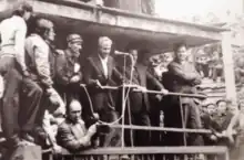 Visibly shaken according to Dobre,[8] Ceaușescu gave a halting 5-hour (other sources say 7-hour)[6] speech that was soon interrupted by boos. Beginning in a trembling voice, he made an initial, hopeless attempt to send the miners back to work: "Comrades, this is not the war… this is a disgrace for the entire nation… a disgrace! I have taken note of your grievances." He tried to explain the party's policy and appeal to the miners through demagogy, claiming that the party leadership had wanted to reduce working hours but that the miners had resisted, which insult to their intelligence was met by cries of "It is not us! Bandits, thieves!" A general murmur of the crowd ran through the speech, along with protests and outbursts of anger; whenever Ceaușescu began to stumble over his words, some of the men booed and whistled. Proposing that the six-hour day be introduced gradually at Lupeni and then at the other mines, the men replied, "A six-hour day from tomorrow." Toward the end, when, angered by their audacity, he still refused to grant an immediate six-hour workday, phrases loudly heckled included "He has no idea what the people's interests are" and "He is not concerned with the workers' fundamental interests". Starting to threaten them, Ceaușescu warned that "If you do not go back to work we'll have to stop pussyfooting around!"[9] According to observers, "Down with Ceaușescu!" was then heard after prolonged booing, an account confirmed by Verdeț. Only when Dobre seized the microphone and urged the miners to let Ceaușescu finish did the atmosphere become less charged. At that point he saw that his only exit lay in making conciliatory promises he had no intention of honouring; using the wooden language that miners trust, he promised to resolve their grievances (agreeing to a six-hour workday for everyone, with Saturdays and Sundays off, and to build factories that would provide jobs for miners' wives and daughters), vowed those responsible for the miners' discontent would be brought to account and that there would be no retribution,[9][10] and was applauded. Verdeț and Pană were released and the strike came to an end immediately after Ceaușescu's departure, the men dispersing and some going into the mines for the August 3 evening shift.[9] They even offered to make up the time lost during the strike.[5]