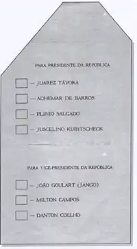 Willing to hold elections in October 1955, President Café Filho tried to present, after a military suggestion, a "national union" candidate.[69] In response to conservative groups, the PSD put forward Juscelino Kubitschek as a presidential candidate.[70] Goulart's candidacy for the vice presidency caused controversy in conservative groups such as the Armed Forces, a feeling that increased after the General Secretary of the Brazilian Communist Party Luís Carlos Prestes voiced his support.[70][71]