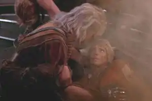 The Enterprise's attacks cause a bulkhead to collapse on Joachim, mortally wounding him. Khan removes the bulkhead and cradles Joachim, whose last words are "yours is superior". Khan then says he will avenge Joachim's death.