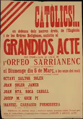 In the late 1920s Roca formed part of an informal Jaimist nationwide network known as "La Protesta"; some scholars claim that together with Melchor Ferrer and Pedro Roma he led the Barcelona cell.[37] Formed mostly by the youth, the grouplets engaged in conspiracy against the regime. Its format emphasized mobilization and search for wider social basis rather than anti-primoderiverista activities, though at one point the Barcelona hotheads considered staging a coup in La Seu d'Urgell.[38] "La Protesta" was somewhat at odds with generally passive policy of the Carlist executive[39] though not necessarily with position of the claimant; since 1926 openly opposing Primo, in his Paris residence Don Jaime remained in touch with the Catalanist and liberal exiles.[40] During Berenguer's dictablanda, Roca decided to actively re-enter official politics; in the last elections of the monarchy in April 1931 he co-ordinated party campaign in the Tarragona province[41] and unsuccessfully tried his luck as a Traditionalist candidate to the local Sarrià council.[42]
