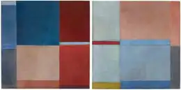In addition to changing her format, Pousette-Dart softened her expressionistic tendencies, instead adopting delicate washes and nuanced variations in hue and tone; Art in America's Robert Edelman wrote that the washes hovered above and activated her surfaces to create spatial complexity and an effect of "quietude with an inner turbulence."[42] For example, Gold Diptych (1994) featured one gently curved canvas atop another larger one, their interaction enhanced by a palette of metallic gold, earth tones, low-key ochres and green-golds, with washes of blue, violet and silver.[42][43] Green Diptych (1994–5) inverted the spatial relationship and mingles deep warm and cool greens that lighten at the edges with centers of swirling circular brushstrokes that suggest empty vessels or voids; New York Times critic Pepe Karmel wrote that this work “reveals a subliminal affinity with Gorky and de Kooning," and likened it to "a landscape lifted into the sky."[43][42]
