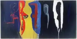 Pousette-Dart's work has eluded any group aesthetic, geographic or other label, or particular set of theories.[33][6][4][25] Robert Pincus-Witten and John Yau suggest that her work extends the modernist vocabulary into new territory through its reimagining of the straight lines, idealized shapes and rigid rectangular format of hard-edged abstraction.[7][10][5] Barbara Rose describes Pousette-Dart's shaped canvasses as developing out of a "poetic sense and personal reaction to sensory experience," which renders them unique in their emphasis on movement and the creation of a panoramic spatial continuum;[1][25] she and others distinguish this more intuitive, eccentric approach from the more programmatic strategies of other shaped-canvas proponents, such as Frank Stella.[5][3][34][2]