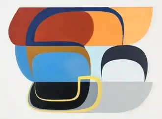 Joanna Pousette-Dart (born 1947) is an American abstract artist, based in New York City.[1][2] She is best known for her distinctive shaped-canvas paintings, which typically consist of two or three stacked, curved-edge planes whose arrangements—from slightly precarious to nested—convey a sense of momentary balance with the potential to rock, tilt or slip.[3][4][5] She overlays the planes with meandering, variable arabesque lines that delineate interior shapes and contours, often echoing the curves of the supports.[6][4] Her work draws on diverse inspirations, including the landscapes of the American Southwest, Islamic, Mozarabic and Catalan art, Chinese landscape painting and calligraphy, and Mayan art, as well as early and mid-20th-century modernism.[7][8][9] Critic John Yau writes that her shaped canvasses explore "the meeting place between abstraction and landscape, quietly expanding on the work of predecessors" (such as Ellsworth Kelly), through a combination of personal geometry and linear structure that creates "a sense of constant and latent movement."[10]