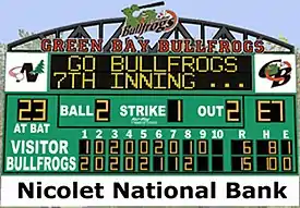 In a press conference on April 2, 2008, the Green Bay Bullfrogs announced renovation plans for the 2008 season. The first phase, done in partnership with Nicolet Bank of Green Bay, included a professional style scoreboard in right center field that is 28 feet (8.5 m) high at its peak and measures 28 feet (8.5 m) wide. It also features a large 20’L x 3’4"H graphics/messaging display and a back lit custom designed truss displays the team name and logo. The second phase of this project involved the installation of a Speed Pitch Radar Display in left center field to visually complement the new scoreboard and allow fans to keep track of how fast a pitcher is throwing the ball.[2]