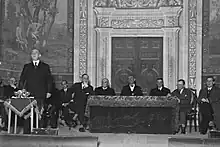 In the Cortes[153] initially Beunza adopted a moderate posture. During his inaugural address in late July he admitted that the Catalan issue appeared more urgent than the Basque one and did not press the cause of autonomous statute. He merely asked that the regular ayuntamientos – in early days of the Republic replaced by appointed comisiones gestoras, the move he considered somehow justified given threat of revolutionary violence – be restored now that the situation stabilized.[154] Beunza did not advance anti-Republican propaganda, though in August in name of Minoría Vasco-Navarra he voiced against exaltation of pro-republican Jaca rebels, executed during last days of the monarchy.[155] In September 1931 – once Estatuto de Estella has been finalised – together with the nationalist leader José Antonio Aguirre and during a solemn ceremony, accompanied by some 400 alcaldes from Basque-Navarrese municipios, he handed the autonomy statute proposal to the then prime minister, Niceto Alcala-Zamora.[156]