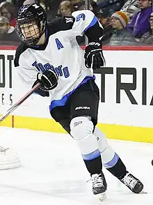 She graduated with honours from the University of Minnesota Duluth in 2011 with a Bachelor of Accountancy. She ended her college hockey career as the Bulldogs' all-time leader in scoring for defencemen with 105 points on 19 goals and 86 assists in 127 games.[14]