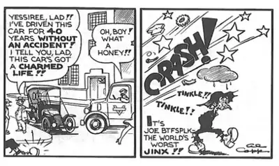 Joe Btfsplk was a character in the satirical comic strip Li'l Abner (published 1934–1977) by cartoonist Al Capp. He is well-meaning but is "the world's worst jinx", bringing disastrous misfortune to everyone around him. A small, dark rain cloud perpetually hovers over his head to symbolize his bad luck. The hapless Btfsplk and his ever-present cloud became one of the most iconic images in Li'l Abner.[1]