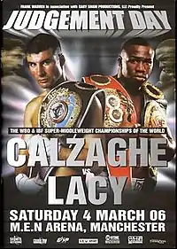 Joe Calzaghe vs. Jeff Lacy was a boxing match that took place on March 4, 2006 in Manchester, England for the WBO, IBF, & The Ring titles. Dubbed "Judgement day", it pitted long-time WBO champion Calzaghe against up and coming IBF champion, American Jeff "Left Hook" Lacy.