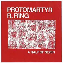 Cover artwork designed by Casey (featuring a drawing by Alex Leonard) for the Protomartyr split single with R. Ring, A Half of Seven (2015).