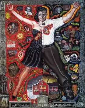 Taken as a whole, Joe Coleman's body of paintings presents an ongoing exegesis of his life, influences, obsessions, family and friends with a particular focus on the pathological and the psychological, the sacred and the profane, pop culture and high art, and the inter-relations between them. He has painted portraits of a broad range of figures, both historical and contemporary, that include saints and sinners, writers (Edgar Allan Poe, Hunter S Thompson, Louis-Ferdinand Celine), artists (George Grosz, Adolf Wolfli), madmen (Charles Manson), actors (Leo Gorcey, Jayne Mansfield), murderers (Ed Gein, Mary Bell, Albert Fish), musicians (Hasil Adkins, Hank Williams, Captain Beefheart), visionaries, freaks (Johnny Eck, Joseph Merrick a.k.a. the Elephant Man). He has also painted portraits of obscure or controversial figures in American history (Boston Corbett; abolitionist John Brown; Swift Runner, a Cree Indian in the thrall of Wendigo psychosis). Over the years, he has also painted portraits of many of his closest friends, including tattoo artist, writer, and painter Jonathan Shaw, and motorcycle builder and stunt rider Indian Larry. He has also produced many self-portraits and numerous portraits of his wife and muse Whitney Ward.[1][16]